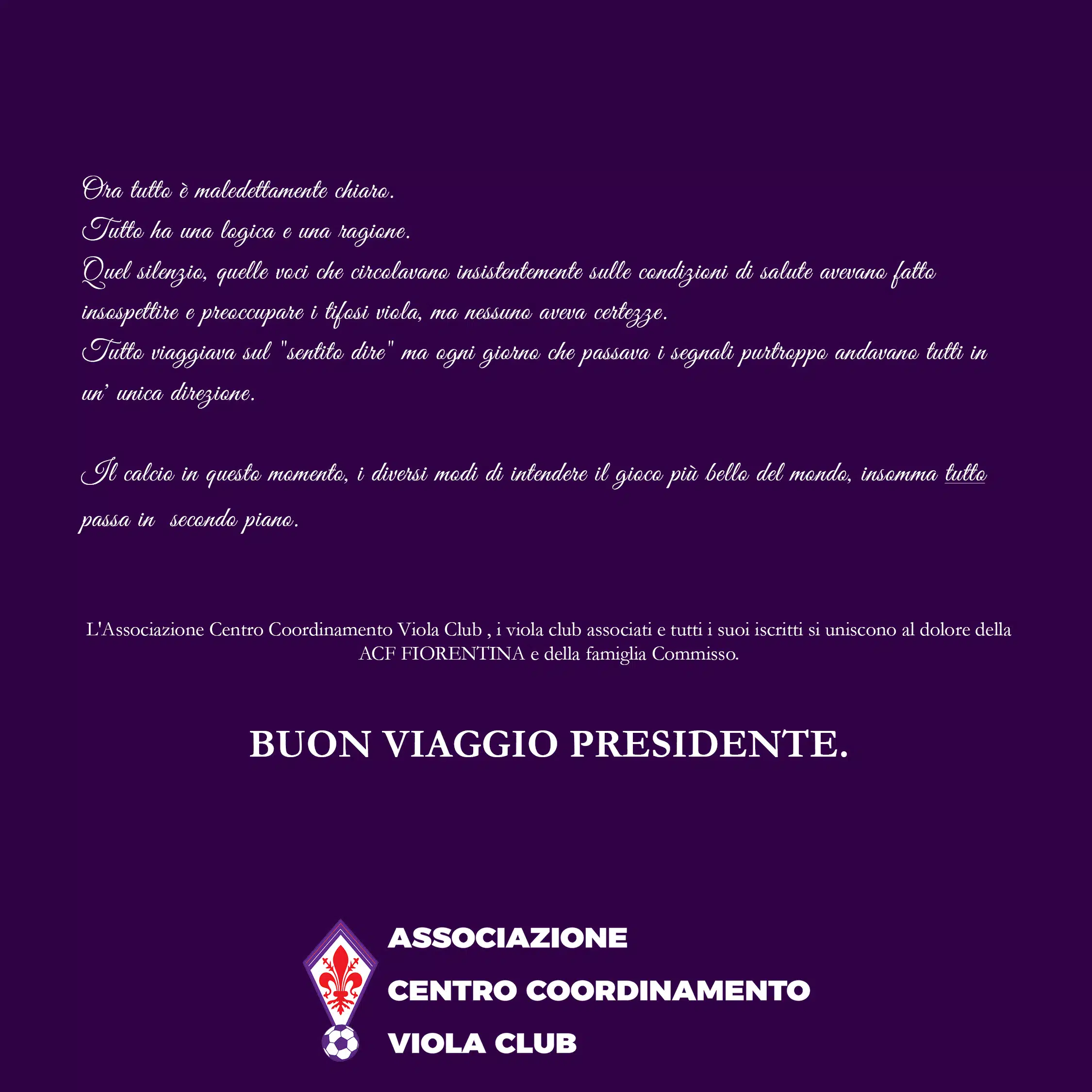 L’Associazione Centro Coordinamento Viola Club , i viola club associati e tutti i suoi iscritti si uniscono al dolore della ACF FIORENTINA e della famiglia Commisso.